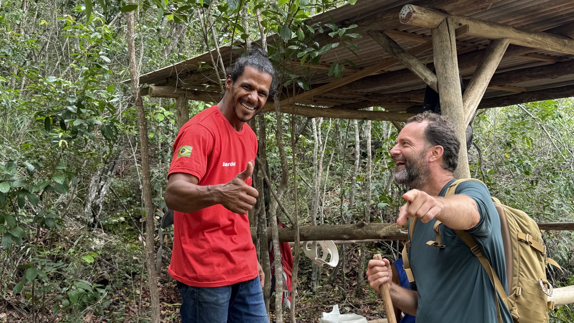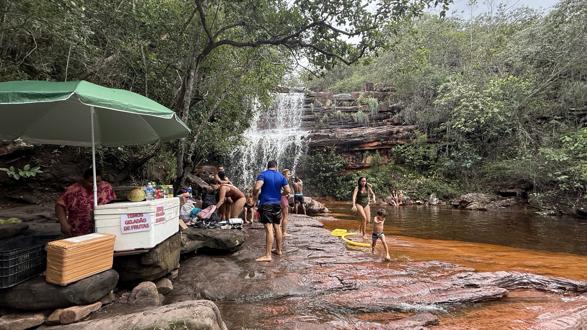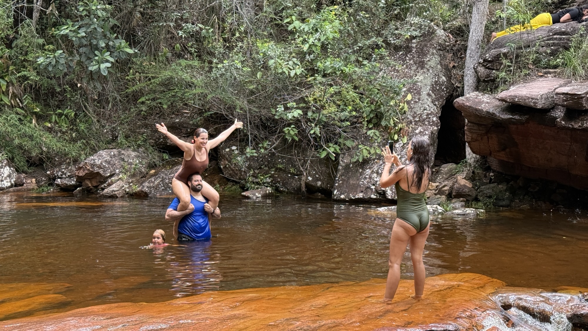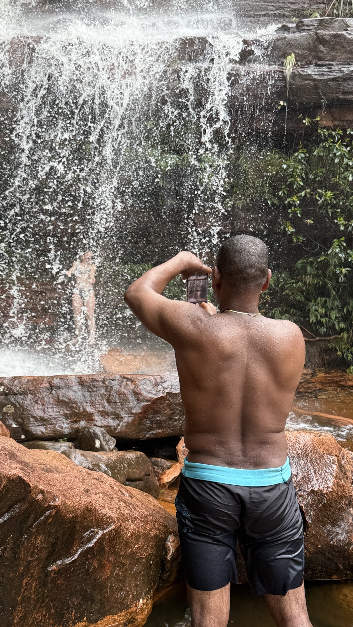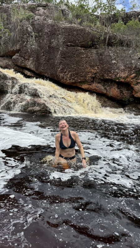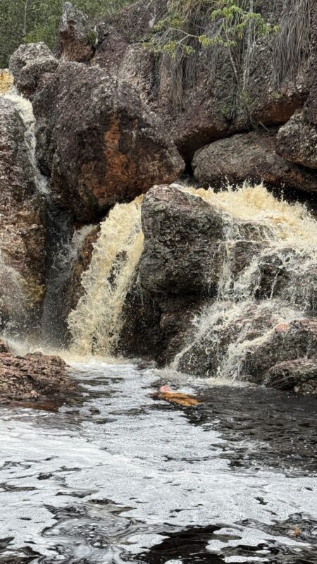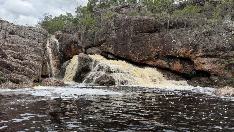 Nach einigen Kilometern und einigen Höhenmetern erreichen wir den Poço do Paraíso. Ein paradiesischer kleiner Wasserfall ergießt sich in ein dunkles Naturbecken und es ist ein Vergnügen nach dem schweißtreibenden Aufstieg im ungemein erfrischenden Wasser zu schwimmen. Dort bin ich kaum rauszukriegen, aber auch Tay springt ins kühle Nass. Überhaupt ist es ein Vorteil, wo immer ich verweilen will, Tay wartet geduldig. Heute breche ich mit der Regel, Fotos von mir nur selbst zu erzeugen. Ich bitte Tay diesen besonderen Moment im Poço do Paraíso festzuhalten.