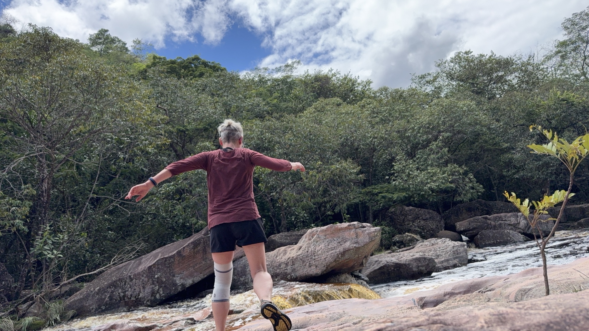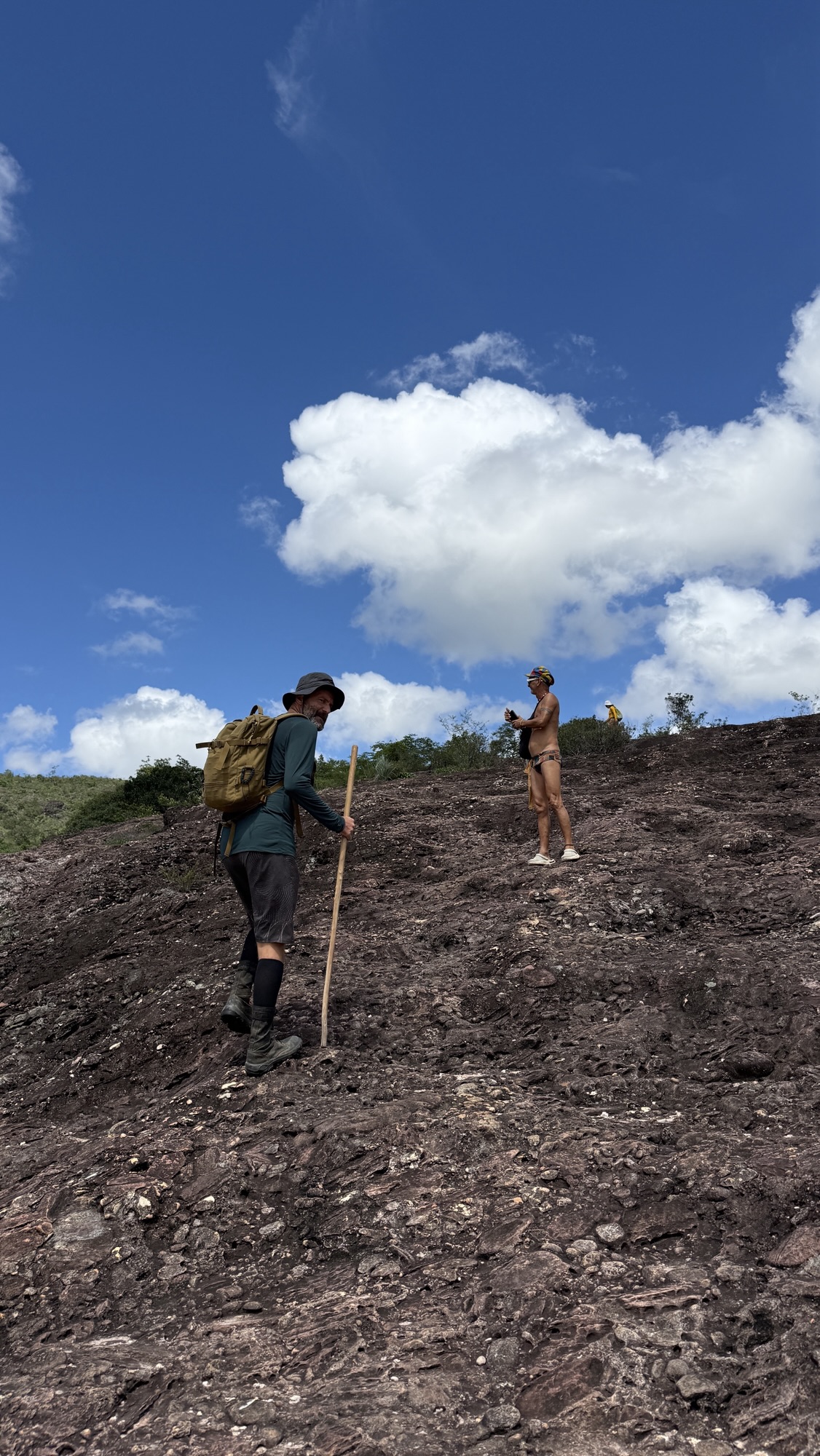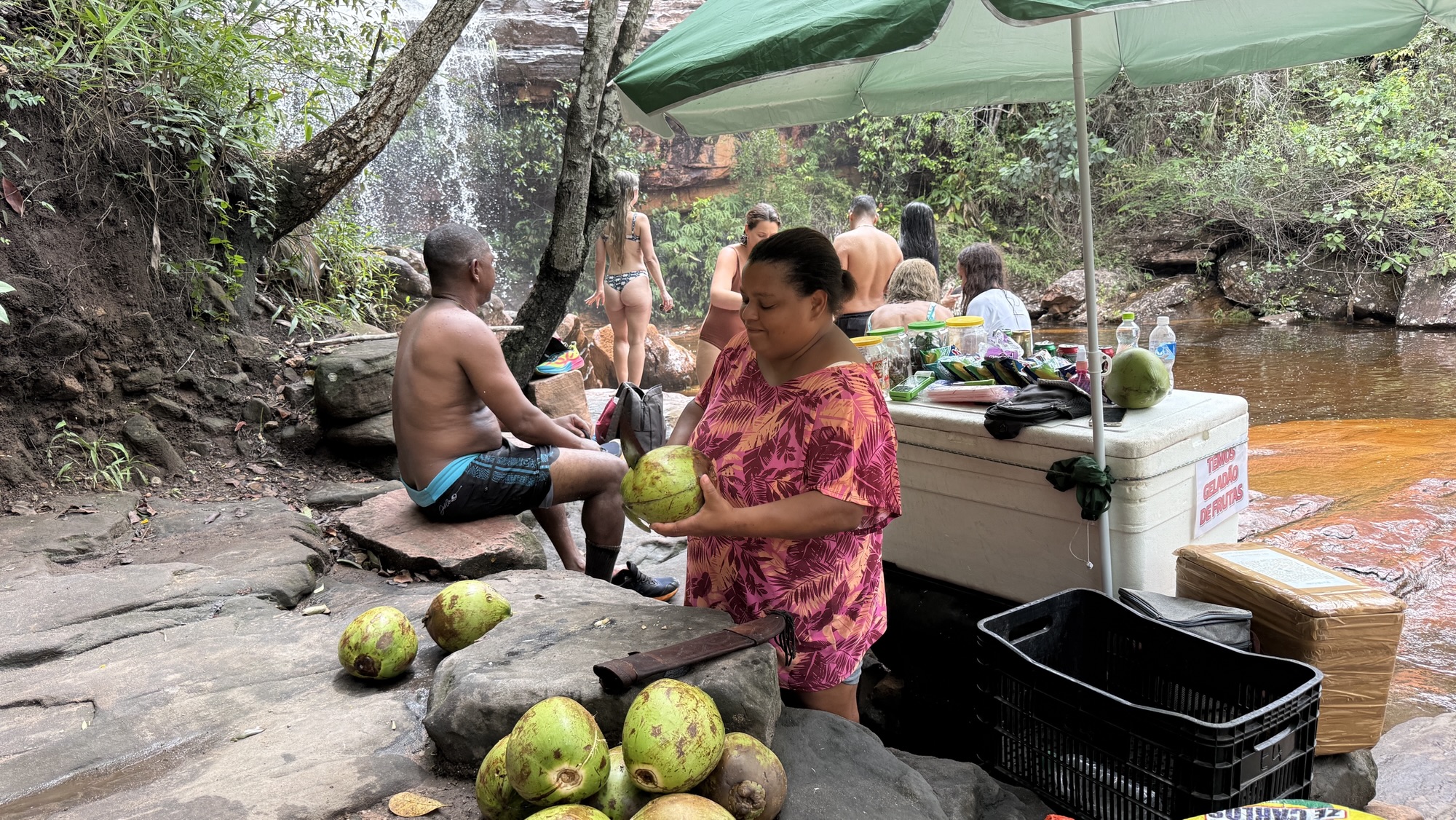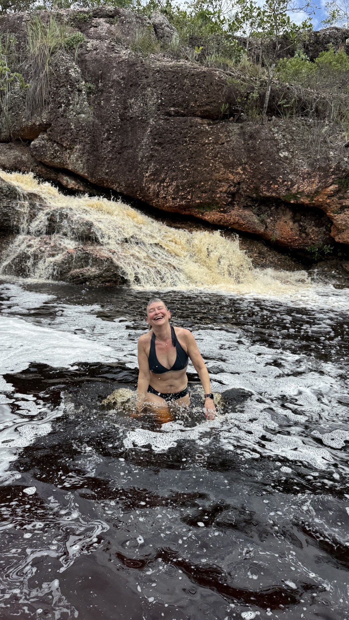 Nach einigen Kilometern und einigen Höhenmetern erreichen wir den Poço do Paraíso. Ein paradiesischer kleiner Wasserfall ergießt sich in ein dunkles Naturbecken und es ist ein Vergnügen nach dem schweißtreibenden Aufstieg im ungemein erfrischenden Wasser zu schwimmen. Dort bin ich kaum rauszukriegen, aber auch Tay springt ins kühle Nass. Überhaupt ist es ein Vorteil, wo immer ich verweilen will, Tay wartet geduldig. Heute breche ich mit der Regel, Fotos von mir nur selbst zu erzeugen. Ich bitte Tay diesen besonderen Moment im Poço do Paraíso festzuhalten.