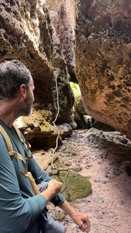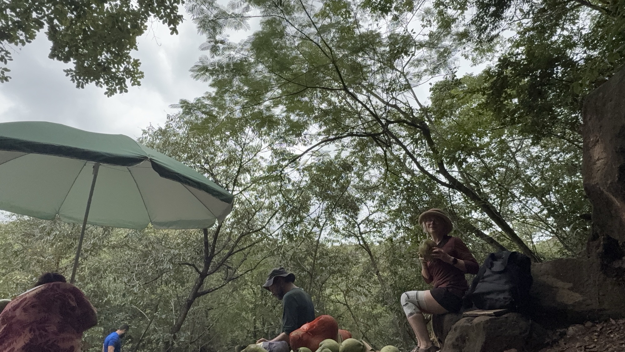 Tay holt mich ab, und wir wandern von meiner Unterkunft aus los. Wir kraxeln über Felsen und waten durch das Wasser. Wir kommen an einer spektakulär farbigen Sandsteinhöhle vorbei, deren Gänge zum Teil von Diamantenschürfern ausgehoben wurden. Es ist ein echter Luxus mit einem privaten Guide unterwegs zu sein. Wo immer wir auf andere Gruppen stoßen, Tay kennt die die Führer und auch die Händler, die selbst in den entlegensten Winkeln ihre Ware feilbieten. Es gibt immer eine herzliche Begrüßung und einen Plausch. Den Kokosnüssen kann ich nicht widerstehen, schon gar nicht der Kokosnussverkäuferin.