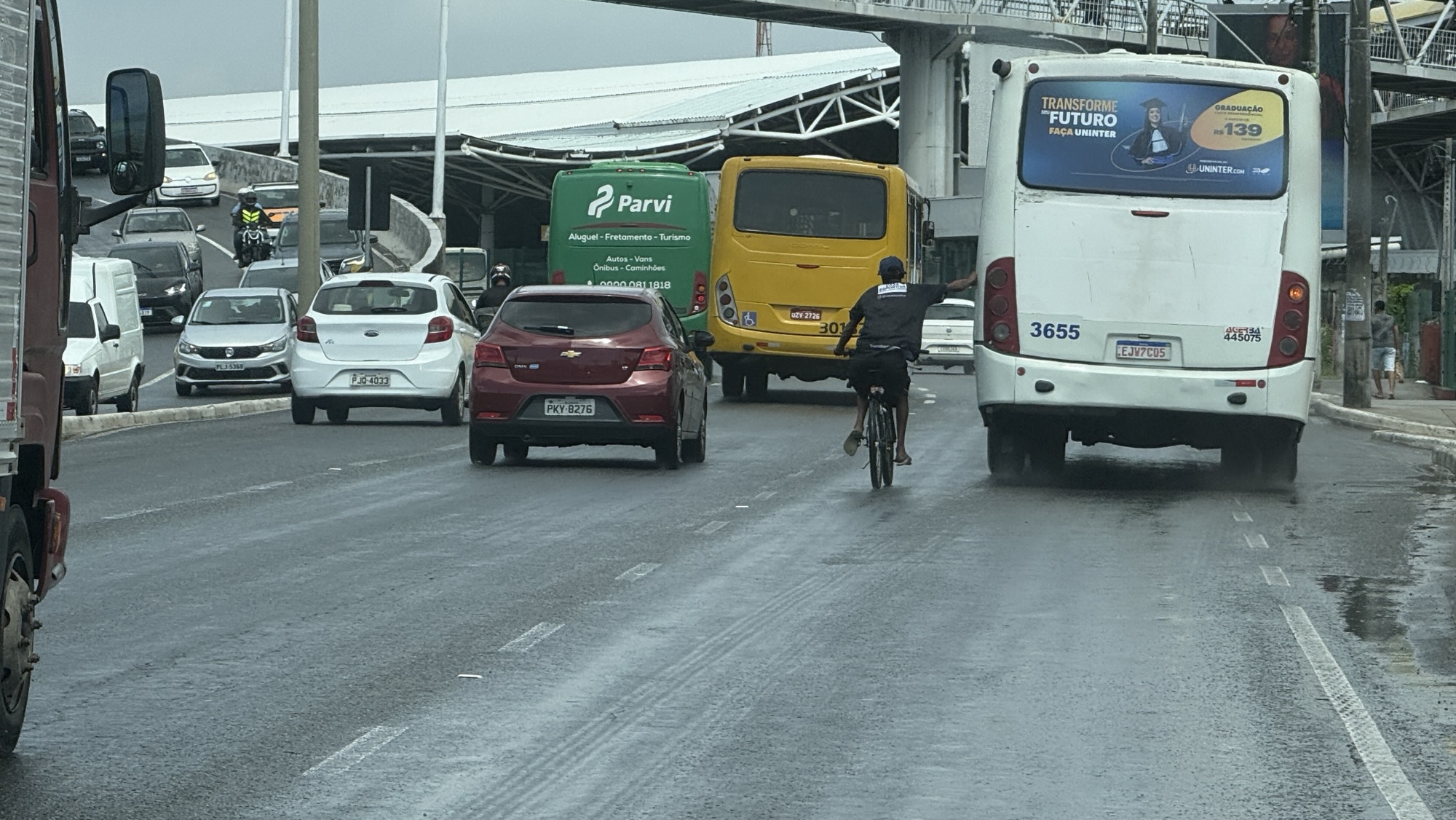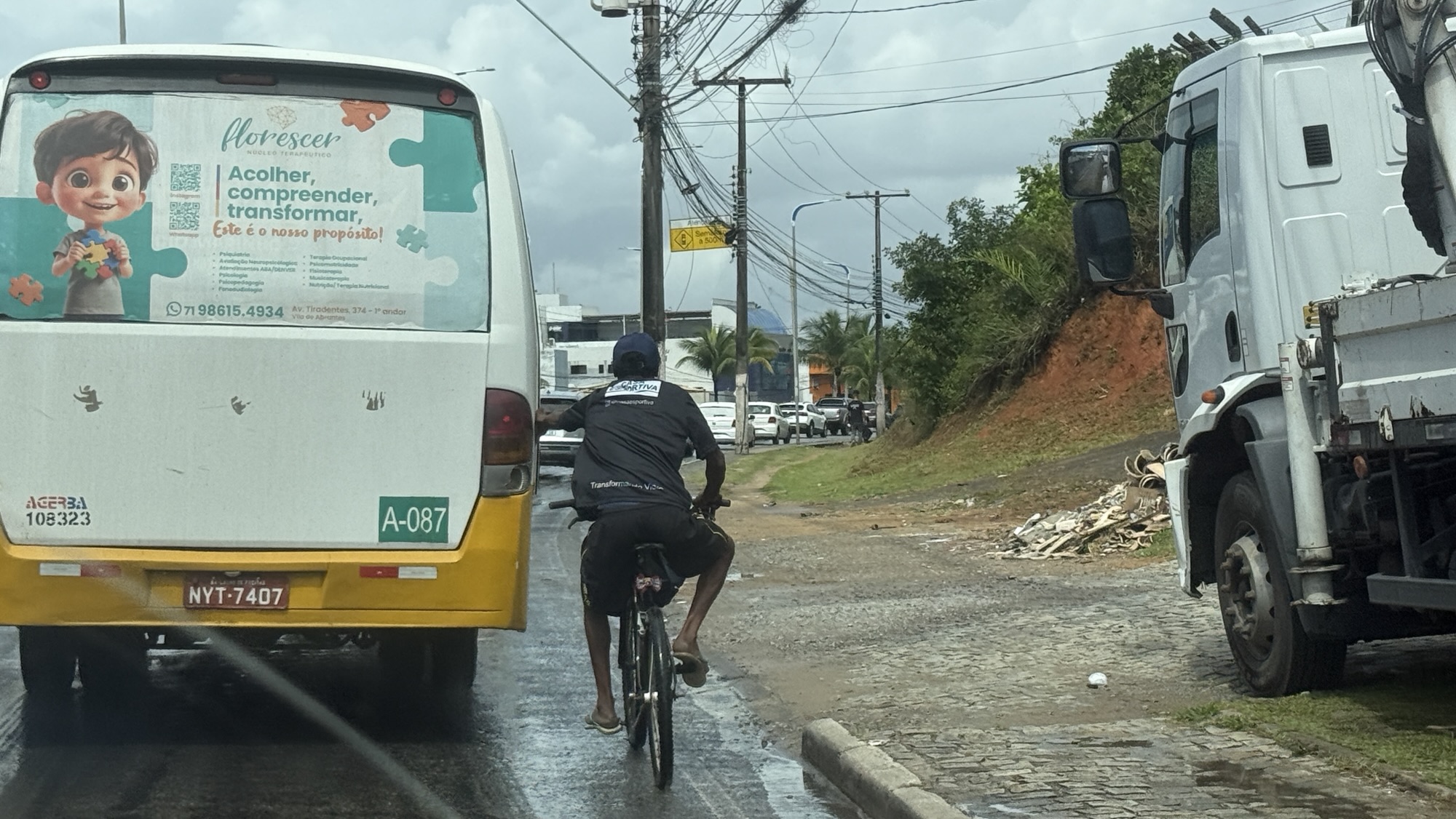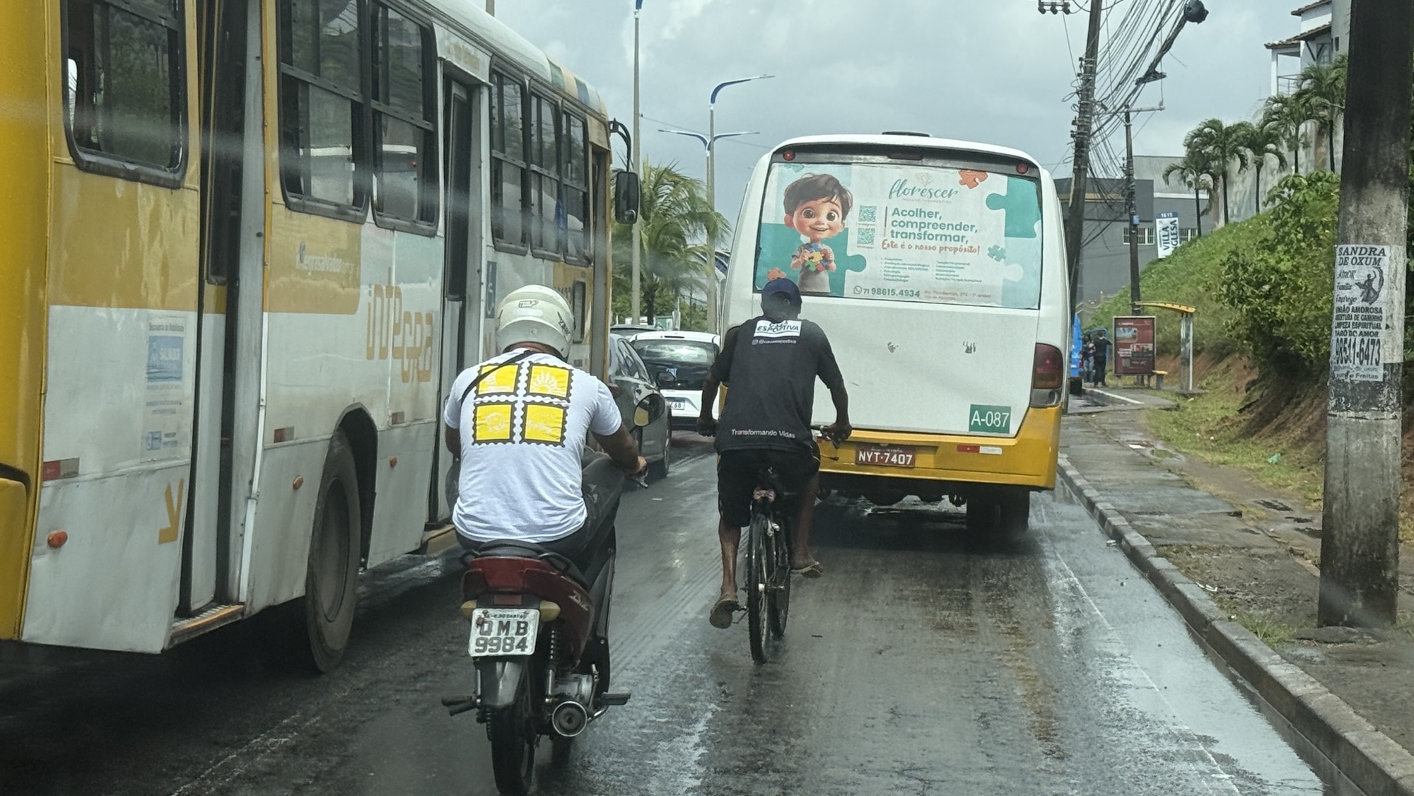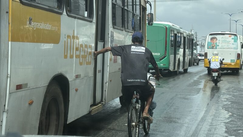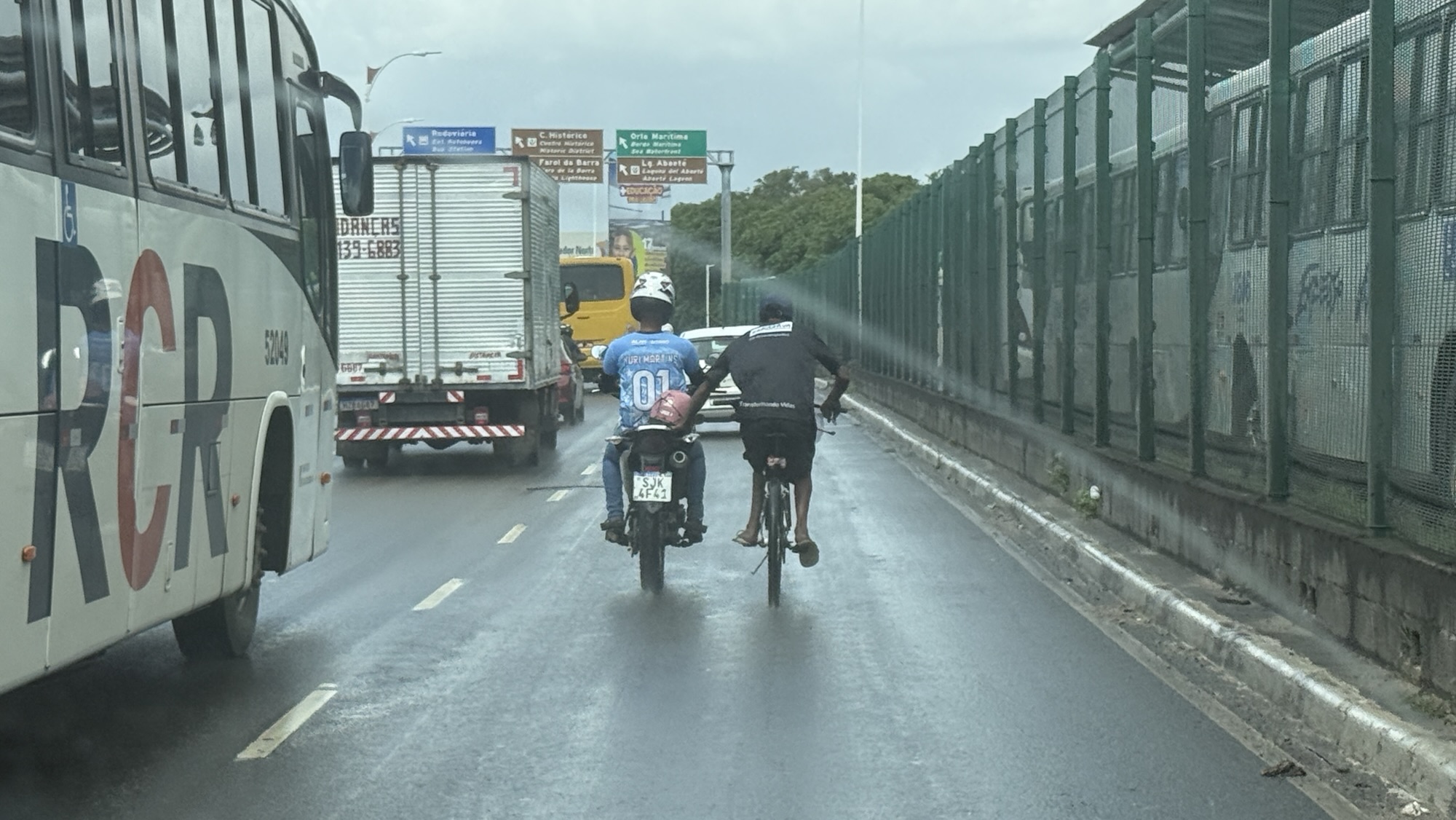 In Brasilien gibt es viele Gefahrenquellen, eine davon ist den Verkehr zu überleben und heil über die Straße zu kommen. Doch ein Radfahrer muss Suizidgefährdet sein, so wie er sich im Stopp and Go der morgendlichen Rushhour verhält. Er hängt sich an jedes fahrende Gefährt, was er erwischen kann.